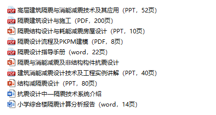 10篇减震与隔震设计资料主要包括:高层建筑隔震与消能减震技术及其应用(PPT,52页)隔震建筑设计与施工(PDF,200页)隔震结构设计与耗能减震房屋设计(PPT,10页)隔震设计流程及PKPM建模(PDF,8页)隔震设计指导手册(word,...