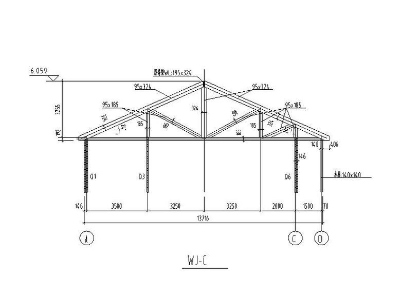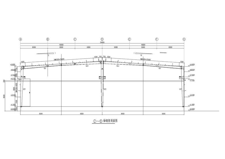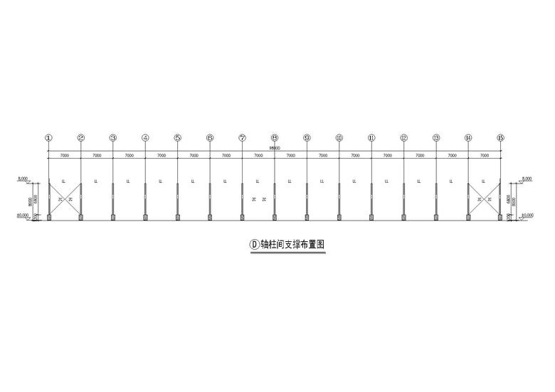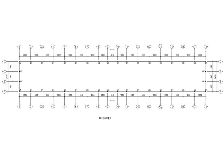 主要内容:本工程为单层单山单跨门式刚架厂房,跨度为24.0m,柱距为7.0m,屋面采用单层彩色压型钢板,墙面采用砖墙,基础采用柱下独立基础。D 轴柱间支撑布置图底层平面布置屋顶平面布置图屋面结构布置图屋面檩条布置图