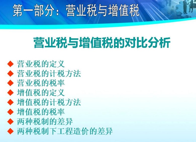 【简介】该资料为山东建筑业营改增计价依据调整宣贯课件,共69页【工程概况】主要内容为山东建筑业营改增计价依据调整宣贯课件【目录】营改增概述文件解读普遍问题营改增与增值税增值税计税方法企业税与增值税