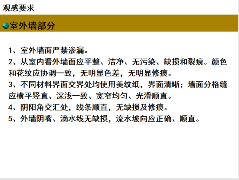 本资料为知名企业防水卷材施工工艺和质量标准,PPT格式,共27页。主要内容:反应粘防水卷材施工质量主要通病和防治:1、凝结浆配比随意问题2、凝结浆现场配置问题3、凝结浆施工刮涂问题4、基底不平整和凝结浆刮涂问题目录:一、...